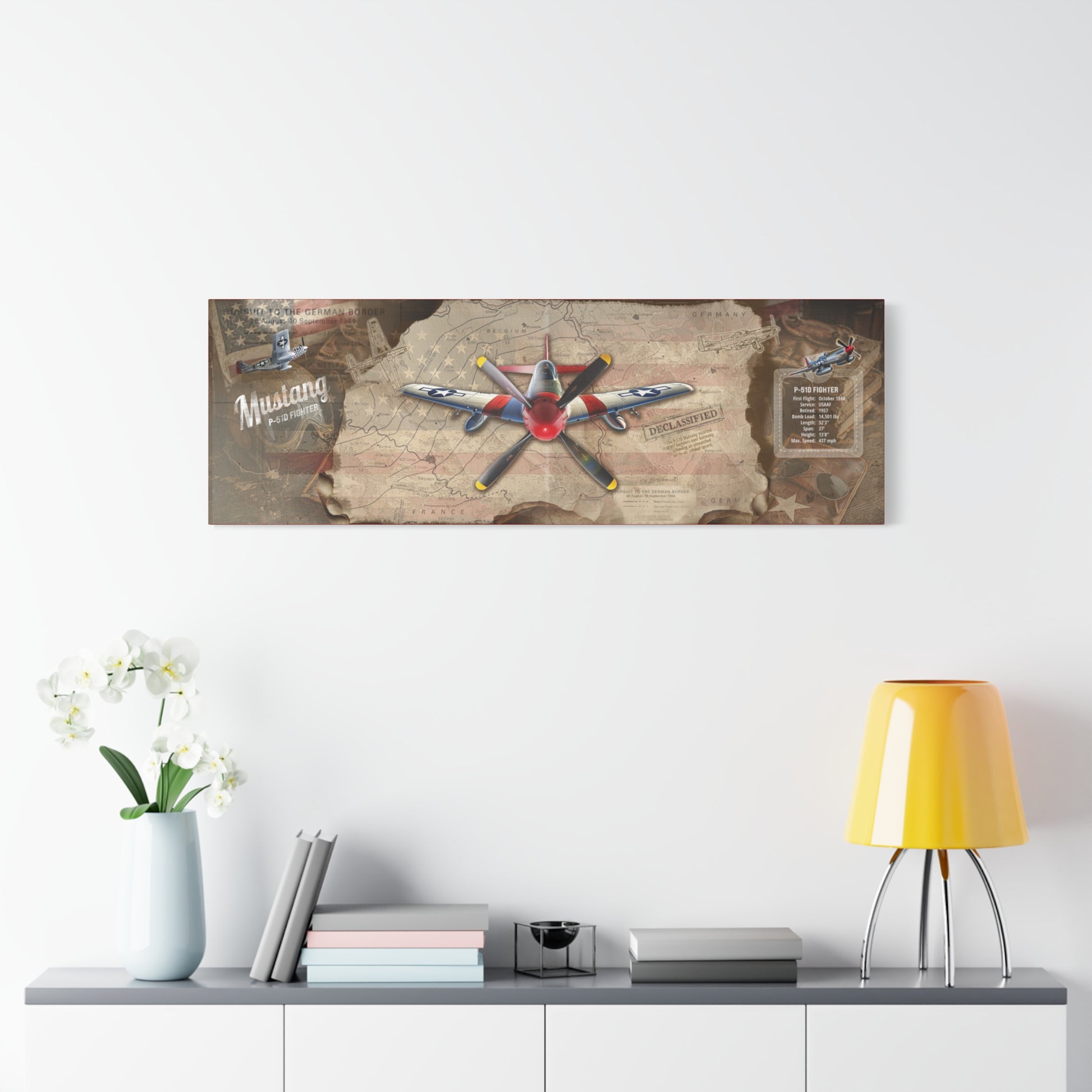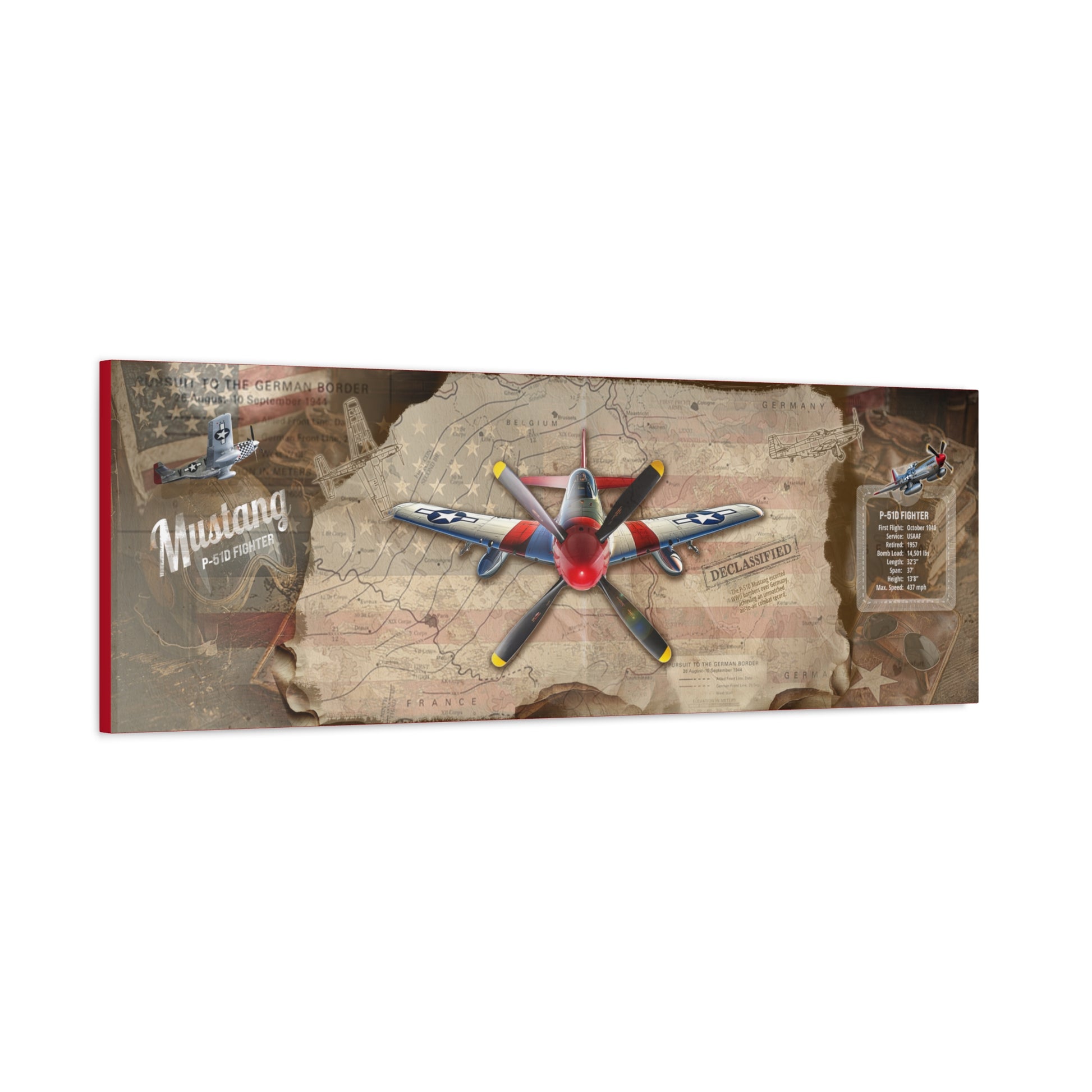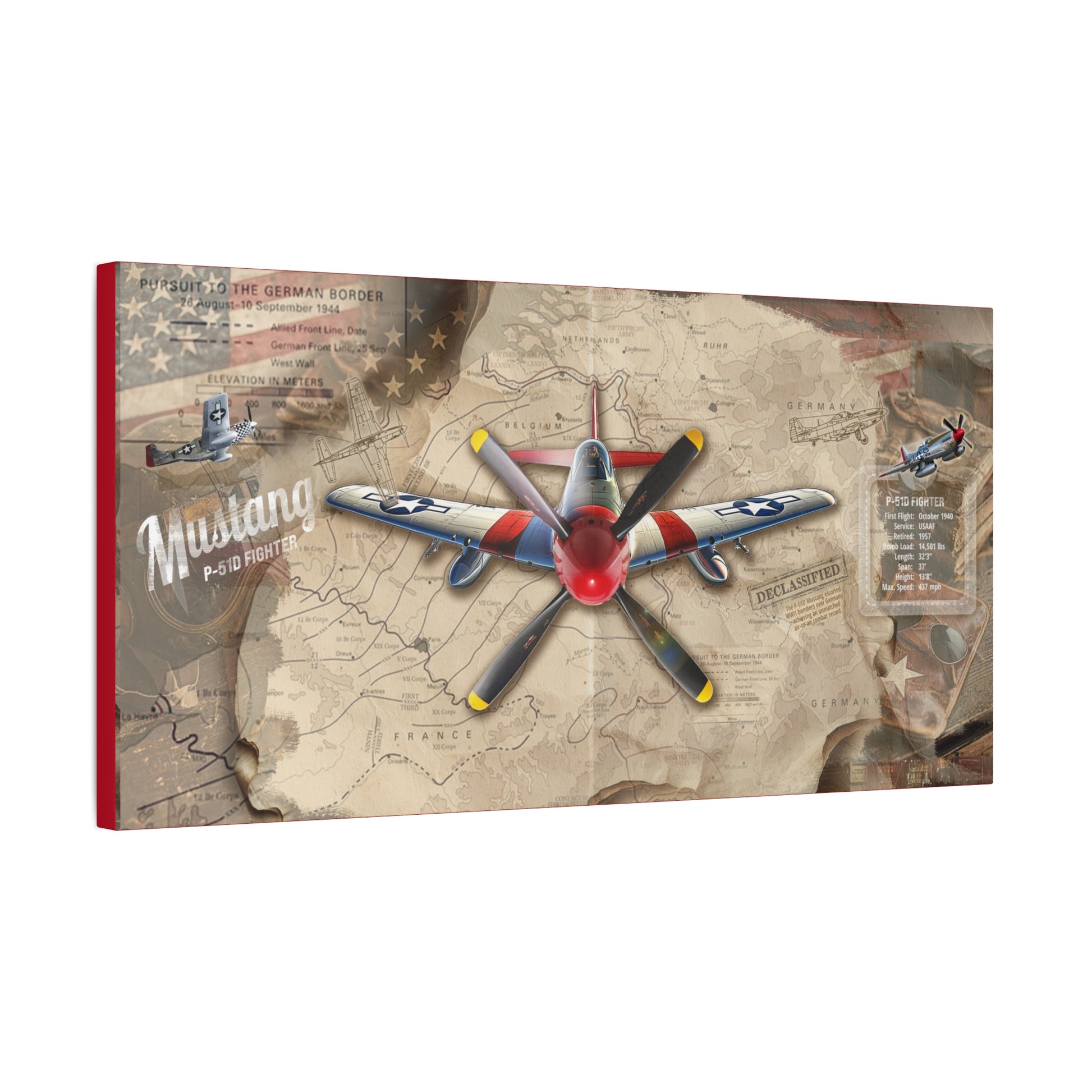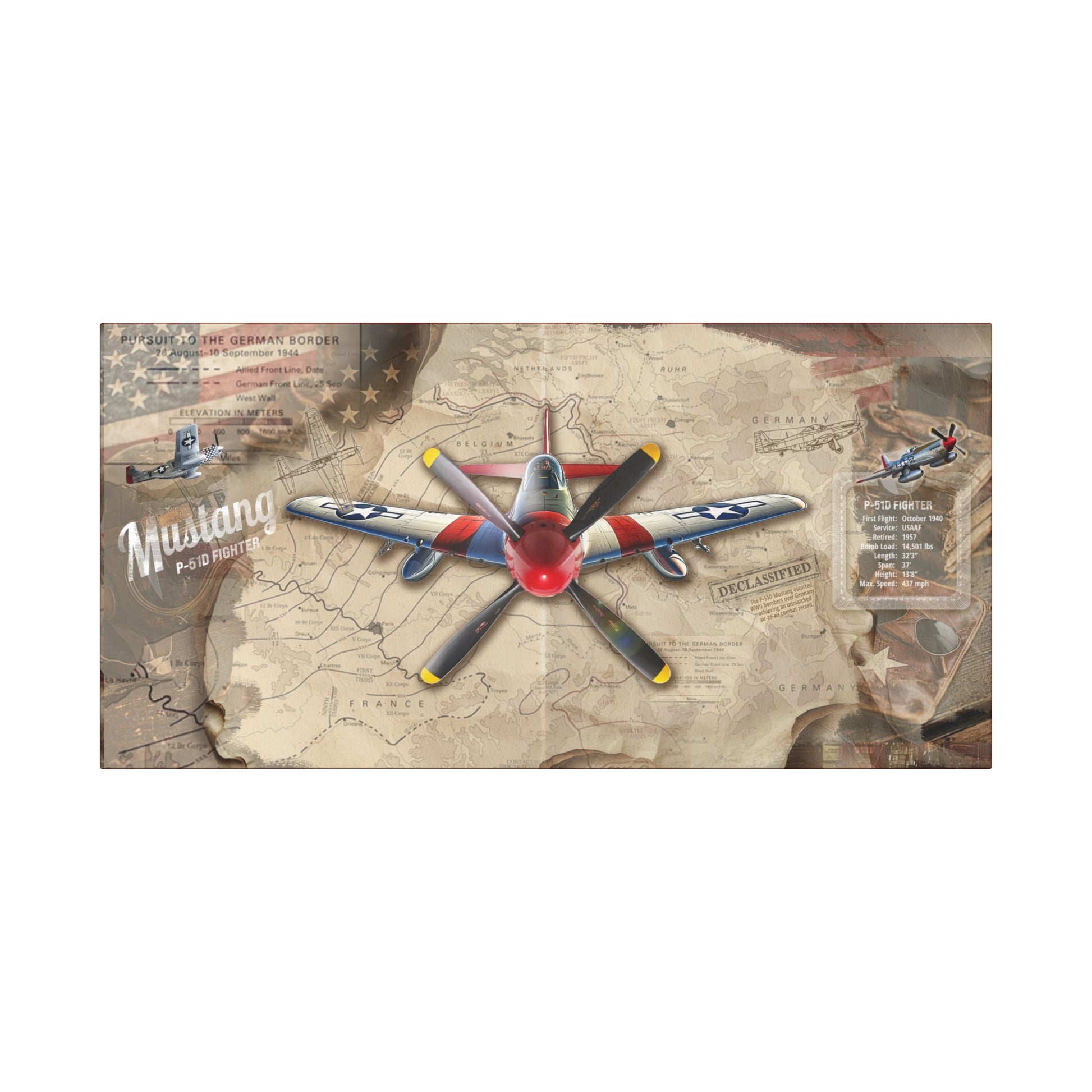 Add a Piece of Aviation History to Your Wall! Secure this limited-edition P-51 Mustang canvas. With authentic declassified maps, historical facts, and exclusive artwork, this canvas is the ultimate tribute to WWII aviation history.