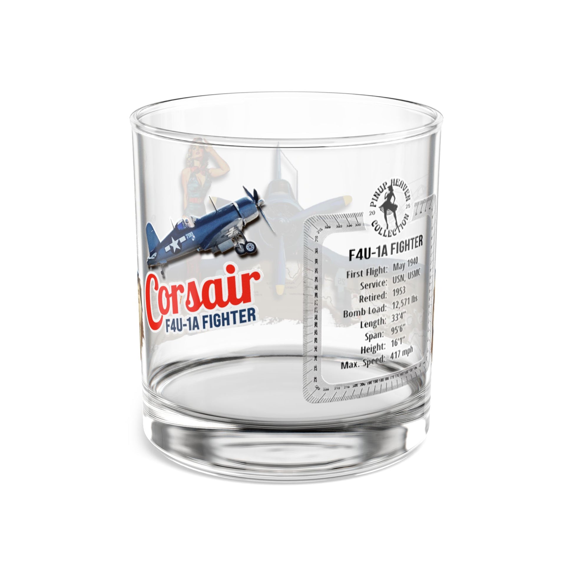 Raise a toast to history, heroism, and high-speed missions with this F4U-1A Corsair Fighter Pin-Up Rocks Glass – 80th Anniversary WWII Commemorative Edition. This 10oz rocks glass blends aviation nostalgia with classic wartime pin-up artistry, featuring authentic WWII-era maps and aircraft facts.